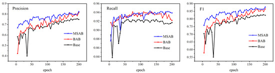 Figure 11 and Table 4 show the detection performance of our proposed module. In Figure 11, we select three representative evaluation indicators, Precision, Recall, and F1, to observe the changing trend of our proposed module on the WHU-CD validation set. By comparison, the baseline model lags behind BAB and MSAB regarding precision, recall, and F1 value. Compared with the baseline model and BAB model, MSAB incorporates a multi-scale hybrid attention module, which improves its ability to extract and process small-scale change building features, reduces the situation of roughness edge and missing prediction labels caused by the lack of explicit recognition of change features, and improves the model accuracy. Table 4 shows the experimental results of our model testing on the WHU-CD test set. Compared with the baseline model, the BAB model in the test set improves Precision, MIoU, and F1-score by 6%, 2.1%, and 3.9%, respectively. MSAB adds the concept of multi-scale based on BAB, which not only enhances the ability to recognize changing pixels but also increases the receptive field and further improves the model’s ability to recognize fine features. According to the changing trend of the evaluation index of the validation set, it can be seen that MSAB has obvious advantages compared with BAB and Base. At the same time, in the test set, compared with BAB, the Precision, MIoU, and F1-score of MSAB are improved by 3.8%, 3.6%, and 2.5%, respectively, which proves the effectiveness of our proposed module.