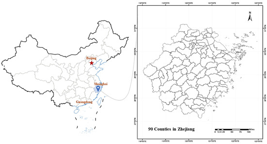 Zhejiang Province is located in the southern part of the Yangtze River Delta on the southeast coast of China (Figure 1), bordering the East China Sea to the east, Fujian Province to the south, Jiangxi and Anhui Provinces to the west, and Shanghai and Jiangsu Province to the north. It is a relatively economically developed region of China and includes 11 cities and 90 counties. Zhejiang is renowned for its picturesque landscapes. It has long been known as “a region of fish and rice, the home of silk, a paradise for tourists, and a land of rich cultural heritage” in China. By 2021, Zhejiang province had built 10,083 A-class tourist picturesque villages, including 1597 3A-class villages. The overall coverage of villages in scenic country areas has reached 49.4%, and 47 of these villages have been selected for the list of Key National Rural Tourism Villages. Furthermore, the scale of the leisure, agriculture, and rural tourism industries exceeds RMB100 billion (USD14.77 billion). Broadly, Zhejiang Province has made outstanding achievements in economic development and urban–rural integration. It has consistently promoted the implementation of the rural revitalization strategy through rural tourism and the creation of new rural areas and ecological civilization, both supporting one another over the past few years. Thus, Zhejiang province is an appropriate area to research tourism-based rural commodification.