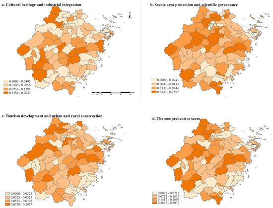 The spatial distribution of counties’ rural living space commodification was formed through ArcGIS 10.7, as shown in Figure 2. The degree of rural living space commodification in each county of Zhejiang Province is different. Meanwhile, the development level differs significantly depending on different dimensions, showing the spatial variation characteristics that the west and north are better than the east and south. The differences in scenic protection and scientific governance are small and common, indicating that in the process of rural spatial utilization and transformation, the overall coverage of villages transforming scenic areas has balanced the development, according to a cross-sectional comparison of the three indicators of cultural inheritance and industrial integration, scenic protection and scientific governance, and tourism development and urban–rural construction. The disparity in commodification between urban–rural construction and tourism development and between cultural heritage and industrial integration is relatively considerable. Through the results of cultural heritage and industrial integration, scenic area protection and scientific governance, tourism development, and urban and rural construction, it could be found that the various index systems are dramatically different, mainly due to the site conditions, policies of the environment, and rural town tourism resources.