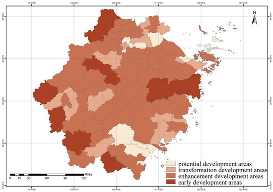 The result of the commodification development potential index is shown in Table 3. According to the scores in three systems, the CDP index in 90 counties was divided into four categories: early development areas, enhancement development areas, transformation development areas, and potential development areas (Figure 3).