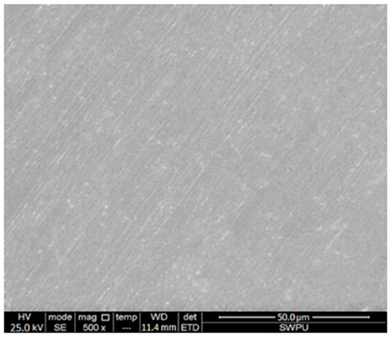 - Material preparation: Steel samples of J55 and N80 were used as the materials of the oil casing and tubing pipes, respectively, and were polished using 400#, 800#, 1200# and 2000# sandpaper successively. The polished test pieces were put in a beaker filled with acetone and then wiped with absorbent cotton to remove impurities. The test pieces were immersed in absolute ethanol for 5 min and put on filter paper. Finally, the test pieces were kept in a drying oven for 24 h and weighed by an electronic balance with an accuracy of 1/10,000 g. The surfaces of the J55 steel were flat before corrosion took place, as shown in Figure 1.