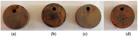 Macro-appearance of J55 steel specimens after static corrosion: (a) H132; (b) W214-5; (c) X124; (d) H128.