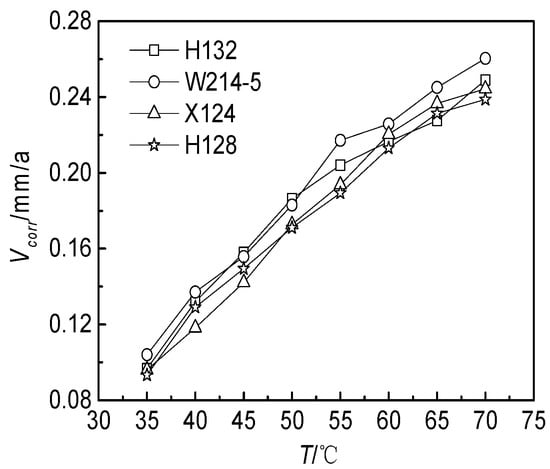 The effect of temperature on the corrosion rate of the J55 steel is shown in Figure 4. The corrosion rates of the J55 steel increased with increasing temperature in the range of 35–70 °C. The reason for this may be that with the increase in temperature, the activation dissolution rate of the metal increased and the corrosion loss accelerated [39]. In addition, the decomposition of bicarbonate was accelerated to produce more CO32− [40].