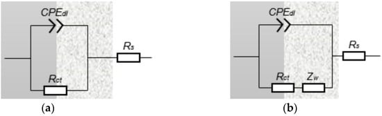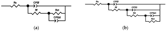 Equivalent circuit diagram of the electrochemical impedance spectrum of the J55 steel at different temperatures. (a) 30 °C ≤ T < 75 °C; (b) 75 °C ≤ T ≤ 90 °C.
