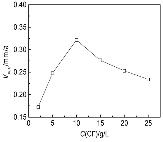 Based on the ion concentration of the produced water from the W214-5 well, the corrosion media were prepared with distilled water and analytical reagents. The concentrations of CO32−, HCO3−, SO42−, Ca2+ and Mg2+ were maintained at 0.12, 0.8, 0.02, 0.7 and 0.2 g/L, respectively, and the Cl− concentration was set at 2, 5, 10, 15, 20 and 25 g/L. The effect of the Cl− concentration on the corrosion rate of the J55 steel was studied at 60 °C for 72 h. As shown in Figure 7, the corrosion rate of J55 steel gradually increased and reached a maximum at a Cl− concentration of 10 g/L after increasing from 2 to 10 g/L. Once the Cl− concentration was higher than 10 g/L, the corrosion rate began to decrease.