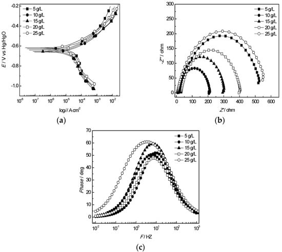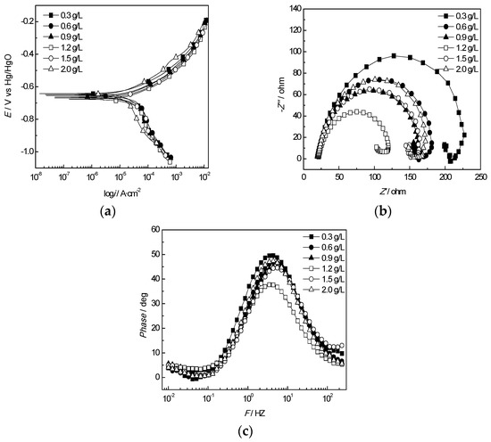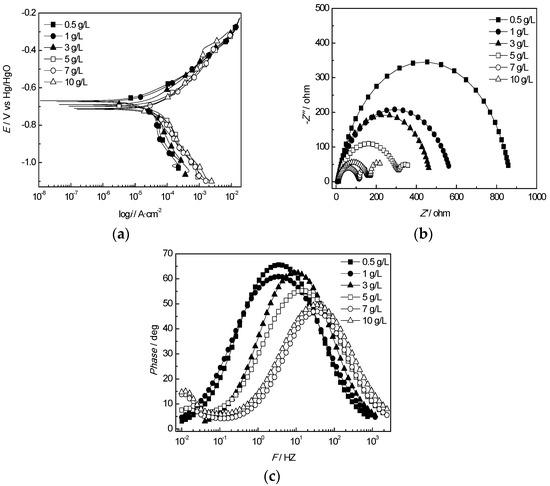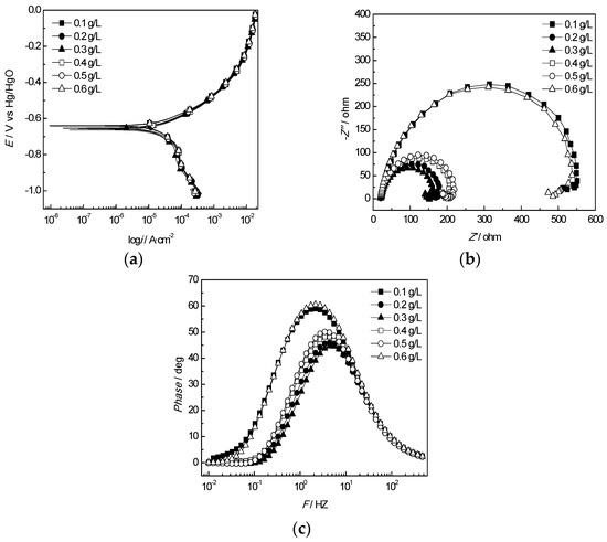 Electrochemical behavior of the J55 steel in the produced water from the W214-5 well at various Mg2+ concentrations: (a) polarization curves of the J55 steel at various Mg2+ concentrations; (b) Nyquist plots of the J55 steel at various Mg2+ concentrations; (c) Bode curves of the J55 steel at various Mg2+ concentrations.