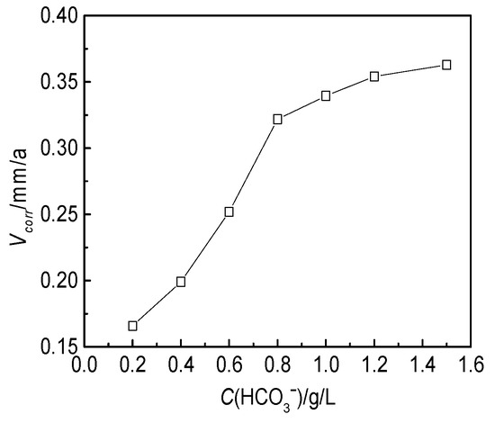 The effect of the HCO3− concentration on the J55 steel was also investigated at 60 °C for 72 h. The concentrations of CO32−, Cl−, SO42−, Ca2+ and Mg2+ were set at constant values of 0.12, 17.0, 0.02, 0.7 and 0.2 g/L, respectively, and the HCO3− concentration varied from 0.2 to 1.5 g/L. The corrosive media were prepared with distilled water and analytical reagents according to the ion concentrations of the produced water from the W214-5 well. A group of parallel experiments was set for each test. The effect of HCO3− concentration on the corrosion of the J55 steel is shown in Figure 9. The corrosion rate of the J55 steel increased rapidly as the HCO3− concentration increased from 0.2 to 0.8 g/L and plateaued as the concentration reached 1.5 g/L.