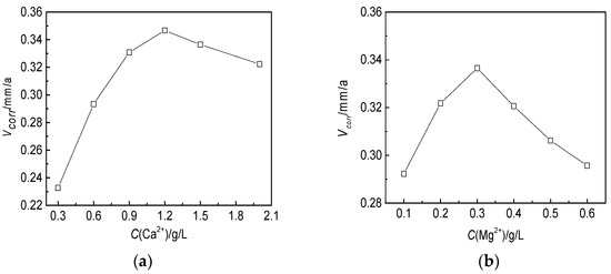 Effects of the Ca2+ and Mg2+ concentrations on the corrosion rate of the J55 steel in W214-5 well water: (a) corrosion rate of the J55 steel at different Ca2+ concentrations; (b) corrosion rate of the J55 steel at different Mg2+ concentrations.