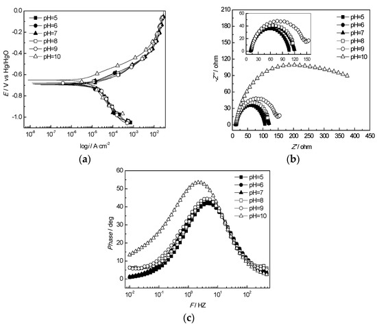 Electrochemical test of the J55 steel in different pH solutions in the W214-5 well-produced water: (a) polarization curves of the J55 steel at different pH values; (b) Nyquist plots of the J55 steel at different pH values; (c) Bode curves of the J55 steel at different pH values.
