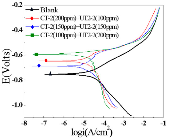 The corrosion potentials of the J55 steel at different combined concentrations are represented in Table 7. The corrosion potentials with different combined inhibitor concentrations were higher than those of the blank group. The minimum corrosion potential difference was 64 mV when CT-2 and UT2-2 were combined at a ratio of 1:1.