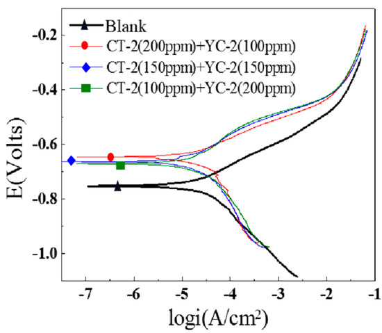 Polarization curves of the J55 steel with different ratios of CT−2 and YC−2.