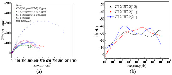 CT-2 and UT2-2 were added into the produced water of the X275 well; the associated EIS curves of the J55 steel are shown in Figure 20. As seen in Figure 20a, the capacitance resistance arcs of the waters with the combined inhibitors were obviously smaller than those with CT-2 alone at the concentration of 0.3 g/L, which showed that the inhibition effect of the combined inhibitors was not as good as that of the single inhibitor CT-2. In the high-frequency region, the shape of the impedance arc curve was similar, but the size was different, indicating that the addition of the corrosion inhibitor increased the reaction resistance. In the low-frequency region, except for the blank group and CT-2 (300 ppm), the second arc was formed. This showed that the addition of the corrosion inhibitor and material transfer needed to be carried out through the pores in the inhibitor film [53,54]. When CT-2 (300 ppm) was added, the curve shape was consistent with that of the blank group, and only the arc radius was enlarged, that is, the mass spectrum corrosion mechanism did not change when two compounds were added, only the reaction resistance was increased [55,56]. From the EIS curves in Figure 20b, it can be seen that the system with concentration ratios of 1:2 and 1:1 for CT-2 to UT2-2 had three time constants; meanwhile, with a ratio of 2:1, it only had two time constants.