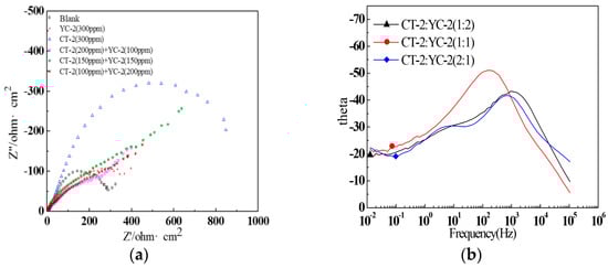 The impedance spectra of the systems with different concentrations of CT-2 and YC-2 were obtained via EIS testing and are shown in Figure 22. The Nyquist diagrams seemed to be composed of a small arc and a long diagonal line. However, the oblique line could not reach the condition of the diffusion process (45° oblique line), which only represented a circular arc with a relatively large diameter. Therefore, the Nyquist diagrams were still composed of capacitive reactance arcs. From the EIS phase diagram (Figure 22b), we can see that the curves of the systems with three concentration ratios had two-time constants, but the curve of the system with the ratio of 1:1 for CT-2 to YC-2 was not obvious.
