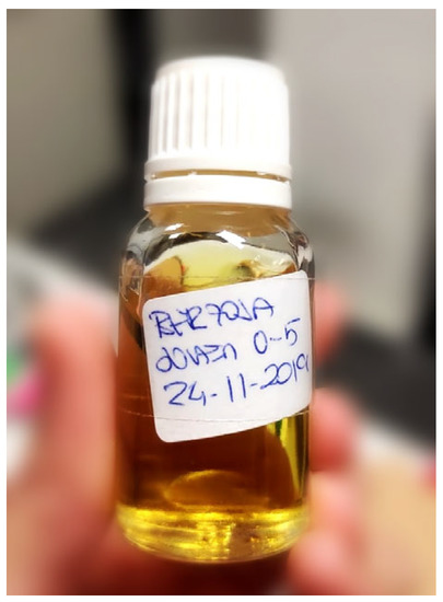On the other hand, a second essential oil, from Pinus pinaster, is used. In this case, the essential oil is a commercial oil (from Natural Essenza batch identification 210610). Both essential oils were stored in transparent crystal flasks, as in Figure 3. The samples were stored in the refrigerator at 3 °C from the reception of the samples to their utilisation. The samples have a volume of 20 mL.