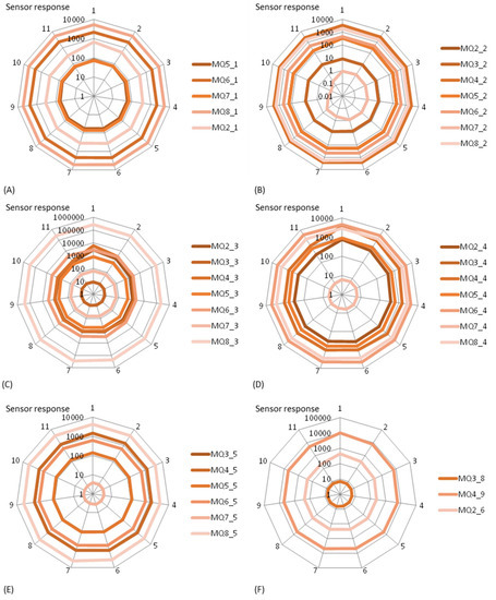 The sensors’ responses when the essential oil of Cistus ladanifer was introduced into the measuring chamber can be seen in Figure 4. The different subfigures, Figure 4A–F represent the data for different chemical compounds. The axes of Figure 4 have no units. From 1 to 11, the time is represented, while, on the other axis, the response values of the sensor.