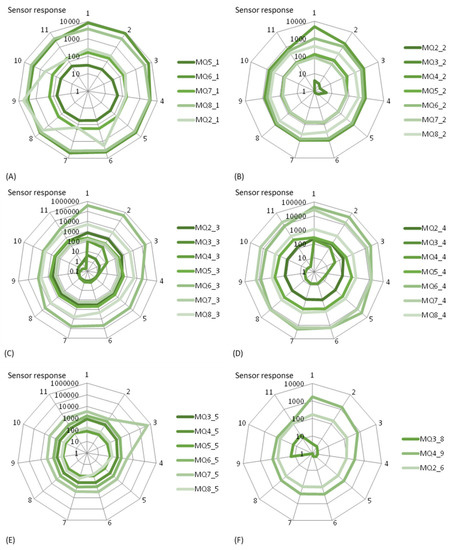 Measures of MQ-XX sensors after removing the Cistus ladanifer essential oil for 11 h. The axes represent the sensor response for each one of the chemical compounds, with no units. (A–F) display each of the responses to the different sensors. (A) shows the response to compound 1, (B) shows the response to compound 2, (C) shows the response to compound 3, (D) shows the response to compound 4, (E) shows the response to compound 5, and (F) shows the response to compound 6, 8 and 9.