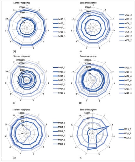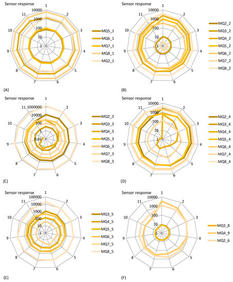 Finally, in Figure 6F, the responses to compounds 8, 9, and 6 are outlined. It can be observed that the three sensors tend to make similar responses, with the MQ4 sensor being the one with the highest response and the MQ3 the least. MQ3, MQ2, and MQ4 tend to decrease their response for their respective chemical compounds as time progresses.