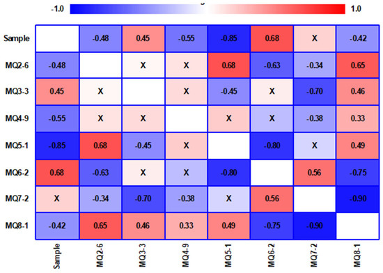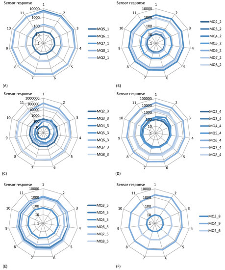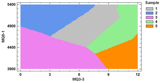 In this subsection, we select for each sensor the equation that better differentiates the samples. For this selection, analyses of variance (ANOVA) are used. A summary of the F-value and p-value for each MQ sensor and each compound is presented in Table 5. The combination of the MQ sensor and equation (or compound) that had a higher F-value, or lower p-value, resulted in the ANOVA being selected. The selected ones are MQ2-4, MQ3-3, MQ4-9, MQ5-1, MQ6-2, MQ7-2, and MQ8-1.