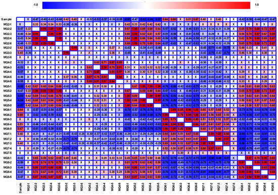 Correlation coefficients of the multivariate analysis with the selected data. The X value indicates that the correlation is not significant.