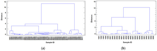 Using these data, new CA, dendrograms, and ANN were generated. The dendrograms of Figure 12a,b include all the selected data and the initial 5 h of the selected data, respectively. The dendrograms showed a more precise differentiation of samples. In this case, no measurements of the empty chamber are mixed with the measurements of the chamber with the essential oil in Figure 12 b. Again, the adulterated and pure essential oil of Cistus ladanifer are differentiated. Regarding the ANN, the results are the same as when all data are included. A success rate of 100% of samples correctly classified is achieved both with all the data and only with the initial 5 h of the data.