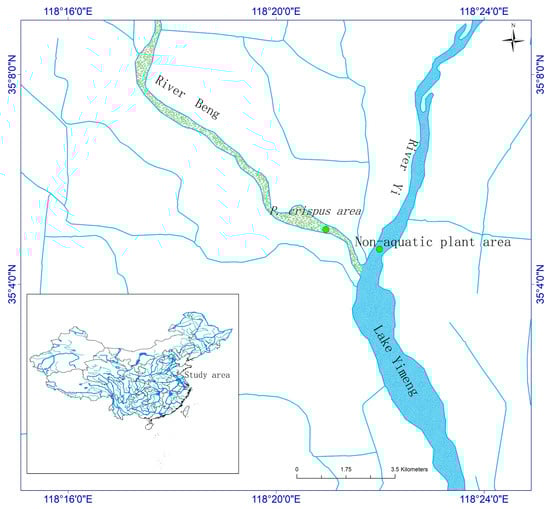 Lake Yimeng was produced in 1997 by the construction of a rubber dam (1135 m) over the River Yi trapping 12 million m3 of water. P. crispus has formed dense canopy-forming populations in the lake in recent decades, covering about 90% of the lake during spring and summer [20]. The River Beng section of the lake (P. crispus region) is connected to the River Yi section of the lake (35°2′40″–35°7′11″ N; 118°22’11″–118°23′12″ E). Two matching sample locations in the P. crispus and non-aquatic plant habitats were chosen (Figure 1).