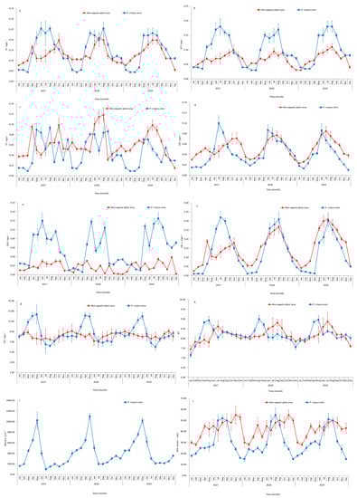 The DTP in the P. crispus area had a similar trend to TP and peaked in summer (from May to August). DTP showed an increasing trend in the area of non-aquatic plants, with the highest concentration being discovered in August 2019. In comparison to the P. crispus area, the DTP in the non-aquatic plant area was significantly lower (p < 0.05). Compared to the P. crispus area, DTP gradually increased and plateaued from winter to summer (Figure 2b). In neither water body was the changing trend in PP evident, but it appeared to increase in summer and decrease in winter (Figure 2c). According to data from various years, there was no significant difference between the non-aquatic plant and P. crispus areas of PP in 2017–2018 (p > 0.05), but in 2019 the content of PP in the non–aquatic plant area increased significantly. SRP increased significantly in the P. crispus area from May to July of 2017, and it increased once more from May to June in 2018 and 2019. After reaching its peak, the SRP gradually dropped (Figure 2d). In general, from 2017 to 2019, TP, DTP, and SRP showed rising trends in the non-aquatic plant area but declining trends in the P. crispus area.