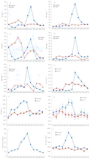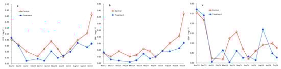 Compared to the control group, the PP decreased significantly in the treatment group from November 2019 to April 2019 but increased significantly in the treatment group from April 2019 to June 2019. No significant differences were detected between the control and the treatment groups from September 2019 to October 2019 (Figure 3c). From the beginning of the experiment, the concentrations of PP in the treatment group decreased rapidly to 0.002 mg·L−1 in January 2019. From January to April 2019, the PP remained at a low level and ranged from 0.002 to 0.042 mg·L−1; however, simultaneously in the controls, the concentrations of PP were at a high level and ranged from 0.08 to 0.13 mg·L−1. The highest value of the PP (0.12 mg·L−1) was in June 2019.