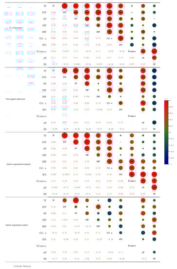 The comparison of indoor and field data revealed that there was no significant difference between the forms of P in the indoor experimental water and those in the field, showing that indoor trials could imitate field settings. The standard deviation of each experimental index in the indoor experiment, on the other hand, was larger than that in the outdoor experiment, indicating that the indoor experimental data have a high level of variability. Simultaneously, there were substantial changes in certain environmental indicators between indoor and outdoor studies. Therefore, while the indoor experiment could imitate the condition of the field experiment, owing to the relatively tiny simulation system, many elements were difficult to regulate, resulting in rather dramatic fluctuations in many indicators of the water body (Table 2). This should be connected to the lesser buffer capacity of the indoor simulation system.