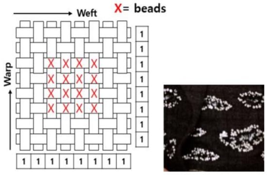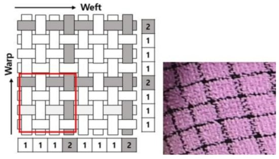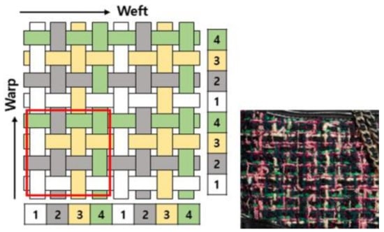 Based on Chanel’s tweed design discussed in Section 2.1, four types of tweed-weaving methods were designed by the author. Figure 1, Figure 2, Figure 3, Figure 4, Figure 5, Figure 6, Figure 7, Figure 8 and Figure 9 are diagrams of the weaving method created by the author, referring to Chanel’s tweed design. For each type of tweed, the types of threads that should be used for warp and weft were classified into thread numbers. The types of threads were expressed with color in the diagrams. Type 1 tweed was woven into a (1 × 1) (X × Y: Xthe number of warp yarn × Ythe number of weft yarn) [44,45,46,47] basic, plain weave (Figure 1). Type 1 is the most basic weaving method, but when using threads from post-consumer clothing waste, a fancy effect can be expected in textile design due to artificial fabric crimps, color change, and deformation. Types 2, 3, and 4 are advanced versions based on Type 1. Type 2-1 tweed was designed so that two-color, textured fancy yarns were arranged and woven with regularity via warp and weft, and a check pattern appeared after the weaving was completed. This type can be categorized into tweeds with 2 × 2 (Figure 2) and 4 × 4 (Figure 3) repeat-weaving patterns. Type 2-2 tweed comprised two types of threads with contrasting textured fancy types, and the color and texture of the number 2 thread for the check pattern stood out more than that of the number 1 thread used for the base. Figure 4 depicts a tweed pattern with an 8 × 8 repeat-weaving pattern using two colors, and Figure 5 depicts a tweed with a 6 × 4 repeat-weaving pattern using the same color but with different textures. Type 2-2 tweed was designed in a repeat pattern similar to the Chanel tweed reference. Type 2-3 tweed comprised threads of various colors woven together. Figure 6 and Figure 7 depict tweeds using three and four colors of threads, respectively. Type 3 tweed was composed of fabric tape with threads; in Type 3, four different-colored threads were placed on the warp line, and three types of tapes and number 1 thread were placed in an alternating pattern for the weft line (Figure 8). Type 4 tweed was a mixture of beads in the Type 1 tweed-weaving method, and various designs were possible based on the bead arrangement (Figure 9).