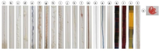 Yarn, fabric tapes, and beads for upcycling tweed: ⓐ–ⓛ fancy yarns, ⓜ–ⓟ plain yarns (brown, gray, and light pink), ⓠ–ⓣ fabric tapes, and ⓤ beads. Photo edited: first author.