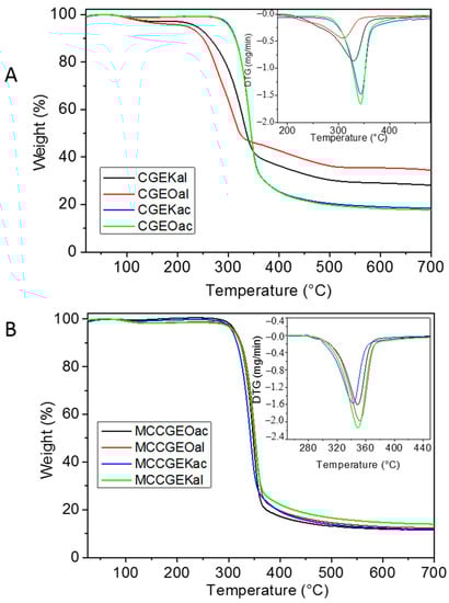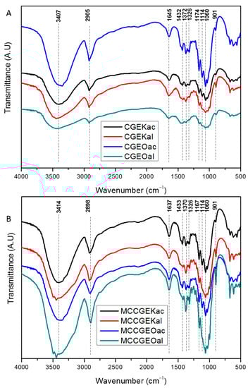 The CrI of samples were 59%, 55%, 50%, and 49% for CGEOac, CGEKac, CGEOal, and CGEKal, respectively. It is noticed that samples modified with acidified sodium chlorite present enhanced crystallinity compared with alkaline-peroxide-treated samples. This observation consolidates well with the FTIR results.