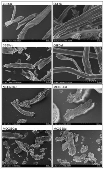 The dimensions of the fibers were calculated using Image J software. For MCC samples, diameters of about 11.7 ± 1.8 μm, 6.12 ± 2.9 μm, 7.39 ± 1.3 μm, and 6.38 ± 2.6 μm were reported for MCCGEKac, MCCGEKal, MCCGEOac, and MCCGEOal, respectively, whereas lengths of 61.6 ± 6.4 μm, 67.1 ± 7.2 μm, 56.9 ± 8.4 μm, and 60.3 ± 7.5 μm were found for MCCGEKac, MCCGEKal, MCCGEOac, and MCCGEOal samples, correspondingly. These findings reflect the microscale of the obtained MCC, indicating the efficiency of the employed hydrolysis methods. Moreover, the obtained results are similar and comparable to those reported in the literature. Indeed, the reported lengths are similar to those of MCC extracted from Eucalyptus sulfate pulp [45] and Posidonia oceanica [46].