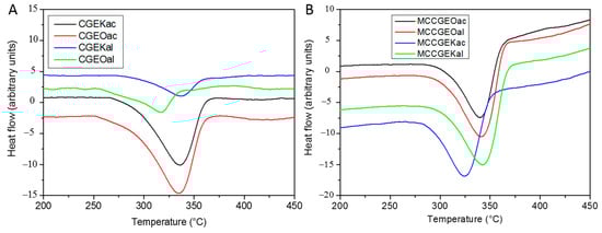 DSC curves of (A) extracted cellulose and (B) MCC samples using kraft and organosolv procedures followed by either acidified sodium chlorite or alkaline hydrogen peroxide treatment.