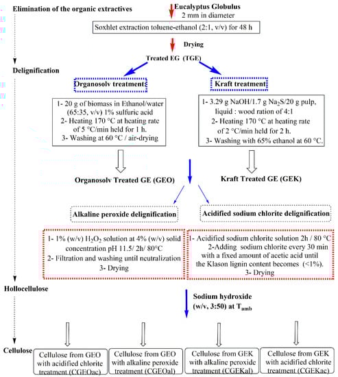 The obtained wood fibers were then subjected to delignification using either the kraft or ethanol–organosolv treatment in a Parr pressure reactor (0.6 L) with a Parr 4842 temperature controller (Parr Instrument Company, Moline, IL, USA). After that, the recovered solid samples were treated either by acidified sodium chlorite or alkaline peroxide delignification. The resulting hollocellulose samples were converted to α-cellulose using a sodium hydroxide solution. The procedure details are illustrated in Scheme 1.