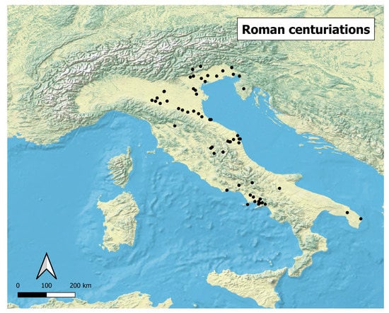 During the Roman Republic and the Empire, a vast amount of land was conquered and incorporated into the Roman domains. As a consequence, it was felt necessary to establish boundaries and to assess lands for censuses and land taxes, as well as to divide the ager publicus for the development of the colonies. The formal act of colonization was known as deductio and it was in this context that Romans divided the land by creating regular patterns of squares or rectangles (called centuriae) marked out by diverse topographical features, boundary stones or different structures, such as roads. These centuriae had two main axes, called cardo and decumanus, that ran approximately north–south and east–west, respectively (Figure 1). Similar systems of land division (limitatio) were previously applied in Italy by Greeks, Oscans or Etruscans [1,2,3], but the Romans adopted unprecedented strategies in terms of scale and skill, and possibly, according to certain cultural elements referred to symbolic aspects, strongly reshaped the conquered territories.