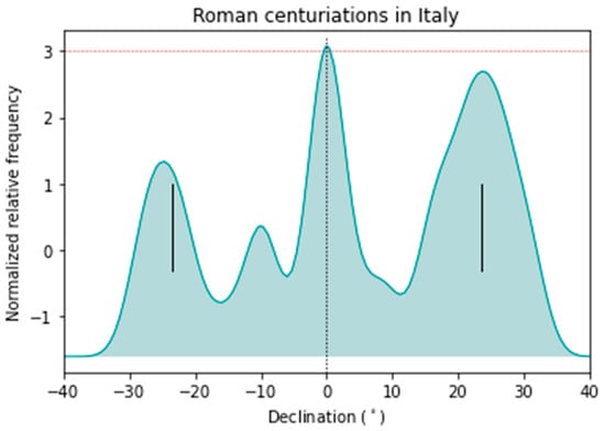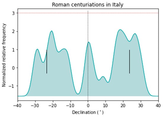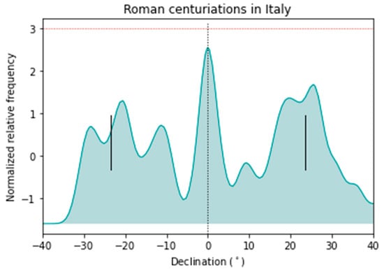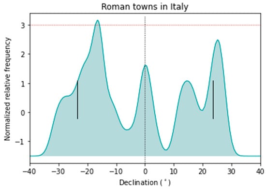 In Figure 8, the declination curvigram of Roman towns is displayed, where 76% of the declinations are within the solar rising arc. As was the case for the previous curvigrams for the centuriations, a Gaussian kernel was used with a passband of 2.5°, taking into consideration a larger margin of error introduced by the measurement of the altitudes and in order to differentiate the maxima. The distribution of towns approximately shares the general trend present in the orientation of the centuriations (Figure 3) to cluster around the equinoxes, mostly avoiding values around −8° and +8°. The diagram presents maxima above the 2σ level grouped in a spread around −18° and 27°, slightly to the right of the summer solstice value (Figure 8). However, the data of the centuriations are in general more dispersed than those of the towns.