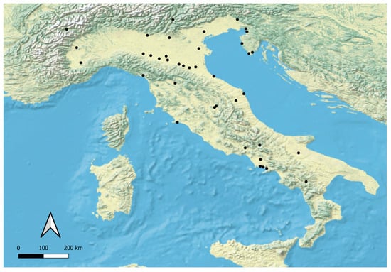 Map with the 42 Roman towns studied in Italy.