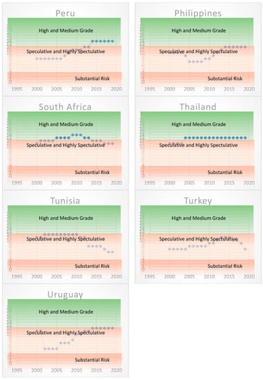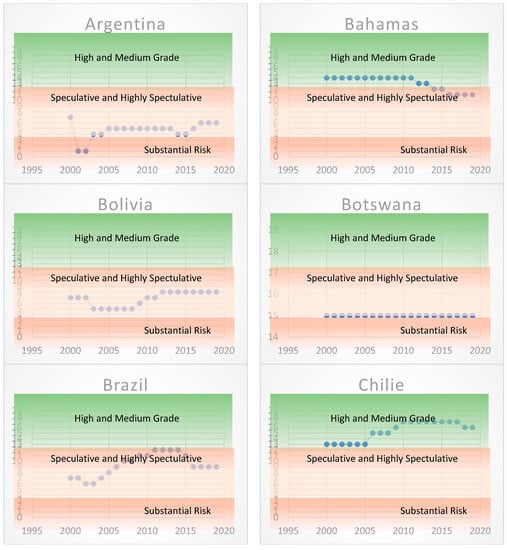 - Montes, G.C.; de Oliveira, D.S.; de Mendonça, H.F. Sovereign credit ratings in developing economies: New empirical assessment. Int. J. Financ. Econ. 2016, 21, 382–397. [Google Scholar] [CrossRef]