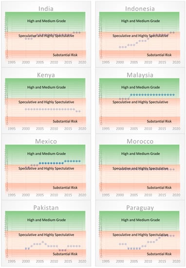 Figure 1 highlights the dynamics of the sovereign rating specific to each country over the sample period. While the ratings of countries such as Morocco and Botswana were stable over the sample period, countries such as Paraguay, Uruguay, Turkey, and Brazil witnessed important fluctuations in their sovereign ratings. We also notice that some countries achieved sustained improvements in their ratings and succeeded to integrate the investment grade (Mexico, India, Indonesia, and Peru). Oppositely, other countries followed a downward trend and witnessed important deteriorations of their sovereign ratings (Bahamas, Salvador, Egypt, and Tunisia).