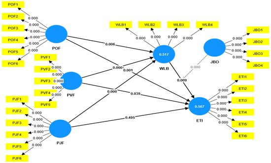 All the study results were analysed at the confidence interval bias of 95%. Specifically, the ETI R2 value signified that 56.7% of the ETI variance was explained by the five exogenous constructs (PJF, POF, PVF, JOB, and WLB). Meanwhile, the POF, PVF, and PJF influences on sustainable WLB were explained by the R2 value of 0.517, which propounded that 51.7% of the variance in implementing sustainable WLB practices was accounted for by the three PEF dimensions. The PEF path coefficient values for POF (β = −0.190 and p < 0.05) and PVF (β = −0.100 and p < 0.05) were significantly correlated to ETI, thus supporting H1A and H1B, while PJF (β = −0.001 and p = 0.495) was negatively, yet insignificantly, associated with ETI, hence rejecting H1C. The path values of WLB (β = −0.137, p < 0.05) and JOB (β = 0.356, p < 0.05) were significantly correlated to ETI, therefore supporting H3 and H5a. Similarly, POF (β = 0.152, p < 0.05), PVF (β = 0.320, p < 0.05), and PJF (β = 0.305, p < 0.05) were positively and significantly associated with WLB, thus supporting H2A, H2B, and H2C. The findings are indicated in Table 4.