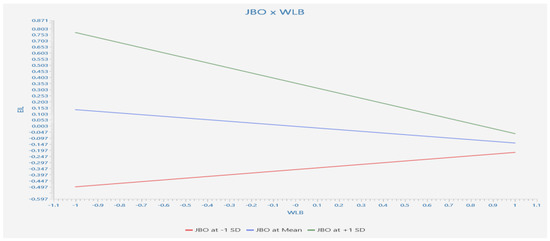 The bootstrapping analysis revealed that JBO (β = −0.278, p < 0.05) significantly moderated the relationship between sustainable WLB and employee turnover intention, thereby supporting H5B. The results are offered in Table 6 and showed in Figure 2.
