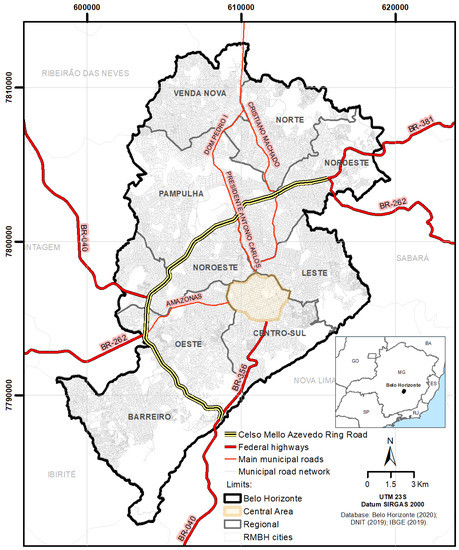 Location map of the Celso Mello Azevedo Ring Road in the municipality of Belo Horizonte (MG). Database: [20,21,22].