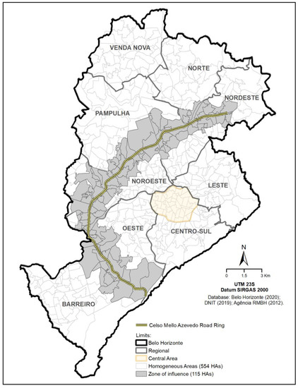 The spatial cuts used to analyze the results in the study area (Celso Mello Azevedo Road Ring) were the administrative regions and neighborhoods of Belo Horizonte. The analysis used the spatial units named in the OD of Homogeneous Areas (HAs) and the segments of the Road Ring, which were part of the research’s methodological procedures. The HAs are aggregations of census tracts and the lowest spatial disaggregation level used in the origin and destination surveys [25]. Using them as a spatial unit of analysis makes it possible to obtain more detailed pedestrian flows, following the System of Spatial Units established for OD Surveys of the Metropolitan Region of Belo Horizonte. Although the municipality of Belo Horizonte is subdivided into 554 HAs, only a portion of these intersect directly (border or proximity) with the Ring Road.