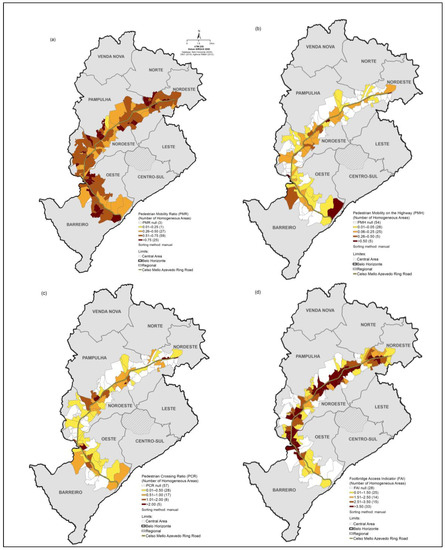 Cartograms representing the results of the (a) Pedestrian Mobility Ratio (PMR), (b) Pedestrian Mobility on the Highway (PMH), (c) Pedestrian Crossing Ratio (PCR), and (d) Footbridge Access Indicator (FAI) in the Celso Mello Azevedo Ring Road. Database: [20,21,25].