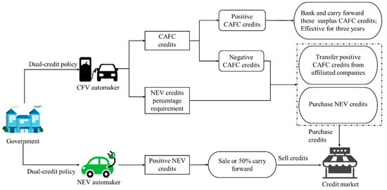- Due to the assessment of the dual credit policy, automakers incur additional benefits and costs. The dual credit policy allows the purchase of NEV credits from other companies to offset negative CAFC credits and negative NEV credits. One positive NEV credit can offset one negative CAFC credit, and it is a one-way credit offset. The NEV automaker earns NEV credits for each new energy vehicle produced , and selling surplus NEV credits to CFV automakers can generate additional credit revenue . According to the Ministry of Industry and Information Technology (MIIT) and the Average Fuel Consumption of Chinese Passenger Vehicle Manufacturers and New Energy Vehicle Credit Accounting Table [35,36] that it issued, among the more than 100 automakers included, none of those producing only CFVs met the fuel consumption target set by the government. If automakers want to produce conventional fuel vehicles, they must purchase a certain amount of new energy vehicle credits to produce them. Therefore, this paper focuses on the case where an automaker produces CFVs, generates negative CAFC credits, and needs to purchase NEV credits to compensate. To meet the assessment standards, CFV automakers need to pay additional credit costs , where is the NEV ratio requirement and is the CAFC credit earned per CFV produced by a CFV automaker. The is the actual CAFC value of the CFV automaker, and is the CAFC compliance value. The previous year’s credit carryover is not considered.