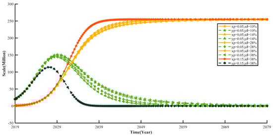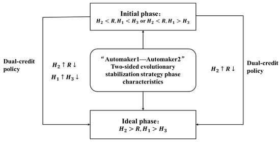 From an analysis of the stability of the evolutionary game strategy, the market automakers’ decisions about what kind of cars to make under the influence of the dual credit policy mostly follow the process of the initial stage to the ideal stage (as shown in Figure 2), and the system needs the dual credit policy to be regulated to move forward in its evolution. In the evolutionary process, some automakers choose to produce new energy vehicles, while other automakers continue to produce conventional fuel vehicles. These two types of automakers generate competition relationships in the market, which are similar to population competition. The growth of either party will further compress the potential growth space of the other party and affect the development speed of the other party. When individuals of two different species share limited resources in the same area, interspecies competition may occur and inhibit the development speed of the two species. The specific impact of the regulation means of the dual credit policy on the diffusion of production decisions of automakers is of importance. Considering the limited market resources, the development of the automotive industry is affected by the density limitation benefit [31]. The party with a higher revenue can more effectively use the ability of the resources to achieve market diffusion, thus further approaching the stability strategy for the competition density model.