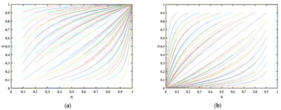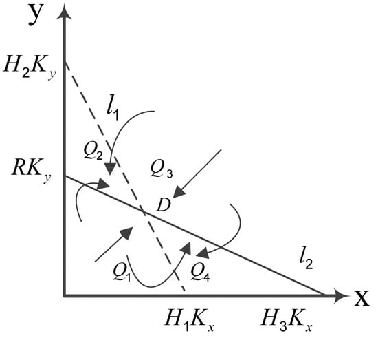 From the analysis of the stability points shown in Table 7, it is clear that the conditions for the existence of stability points in the competitive systems of NEVs and CFVs are . In this paper, the isosceles positioning relationship and the phase diagram analysis methods are combined with track alignment to analyze the system stability. The phase diagrams (Figure 3) of the isotropic lines and are shown below. Since and are greater than zero, the positive and negative aspects of the system are determined by the equations in the parentheses of Equation (15):