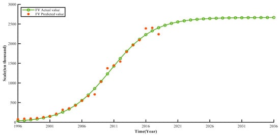 The research data of conventional fuel vehicle market sales were taken from 1996–2018 and were brought to the formula fitted by MATLAB software by using a nonlinear least squares method. The parametric equations are in good agreement with the actual data, as shown in Table 8. The results of the fit according to the table and graph are shown in Table 9 and Figure 4. For the model, in approximately 2030 China’s conventional fuel vehicle market sales gradually reaches saturation, with a saturation value of approximately 26.663 million units. Therefore, in this paper, the maximum market capacity of conventional fuel vehicles was set to 26.663 million units, and the maximum market capacity of new energy vehicles was set to 30 million units due to the stronger sustainable market development of new energy vehicles [42].