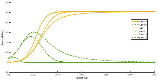 The competitive density game model of new energy vehicles and conventional fuel vehicles can be used to reveal the new energy vehicle and conventional fuel vehicle market size evolution process in China. The and in Figure 6 represent the evolutionary trend when new energy vehicles and conventional fuel vehicles, respectively, develop independently, and and y represent the evolutionary trend of competition between new energy vehicles and conventional fuel vehicles.