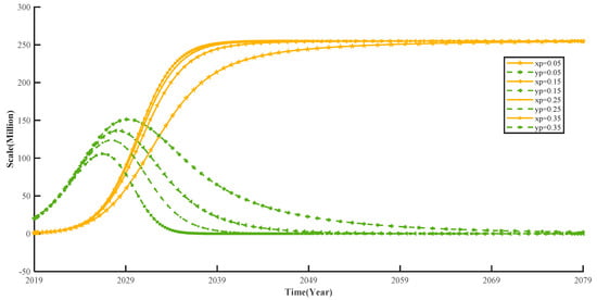 As known from the above Table 7, different parameters have different effects on the steady state of the system. In Table 7, the formula in columns 2 and 3 of row 6 and columns 2 and 3 of row 7 are “>0 and <0”, denoting that due to the dual credit policy and according to the long-term equilibrium stability of the system, the higher the income of NEV automakers selling credits, the higher the cost of CFV automakers purchasing credits, which helps to increase the market share of NEVs at the point of stability and can reduce the market share of CFVs at the point of stability.